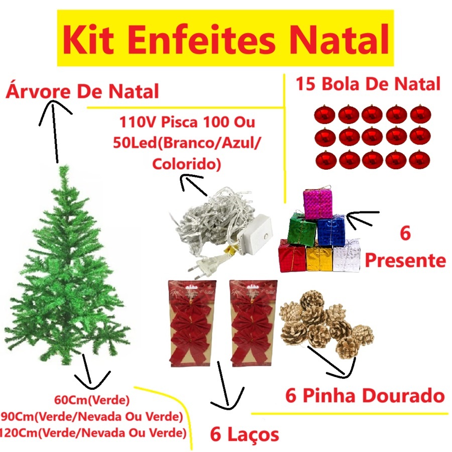 Kit Enfeites Natal Com Árvore De Natal E 6 Presente 110V Luz 6 Laços Pinha Dourada E Bola De Natal