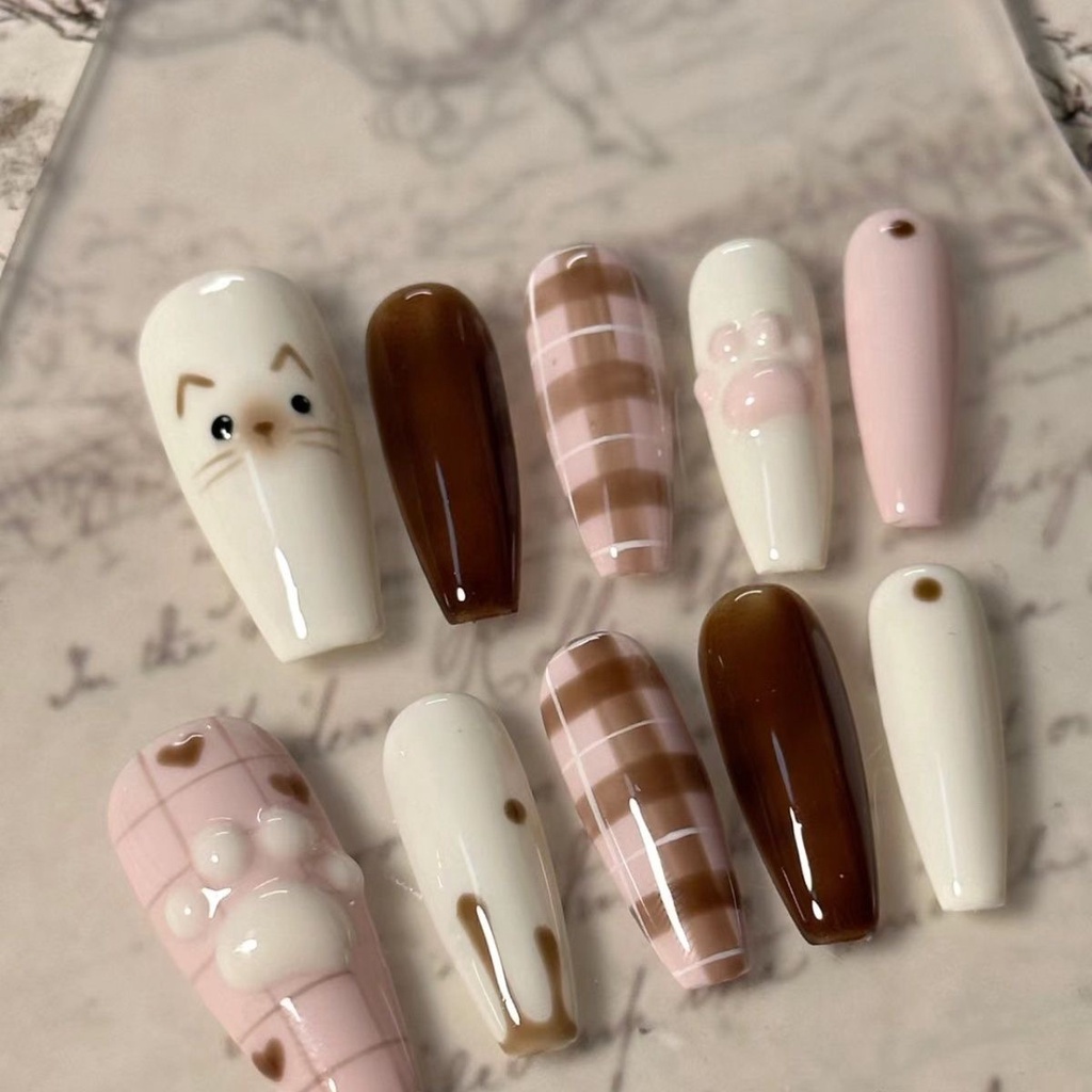 [HANDMADE] Prego artificial morango rosa café xadrez contrastante cor pintados à mão gato suave bonito fototerapia unhas unhas reutilizáveis e removíveis