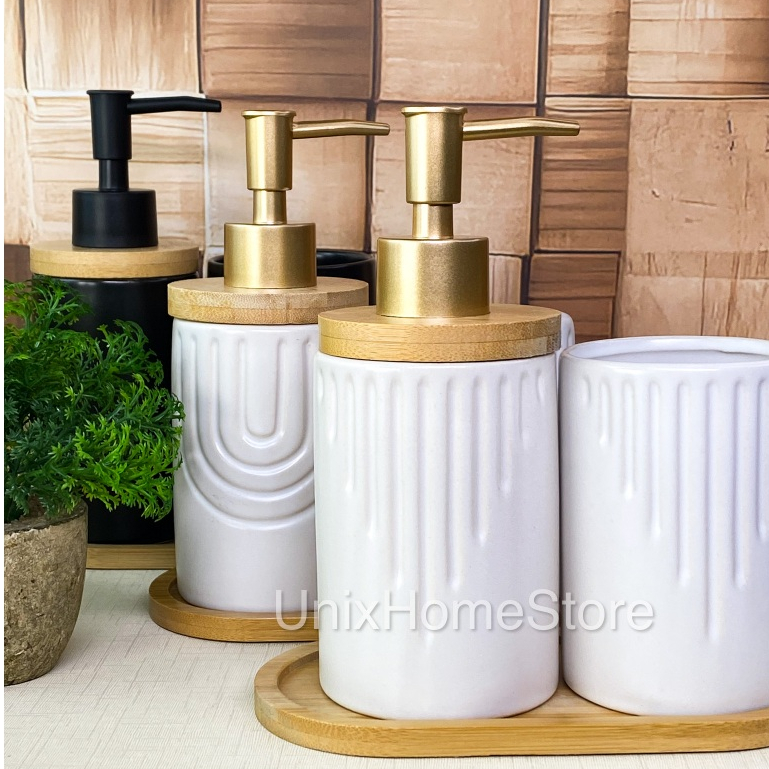 Kit Conjunto Banheiro Lavabo 3 Peças Com Bandeja Oval de Bambu Dispenser Sabonete Liquido Porta Escova Cerâmica