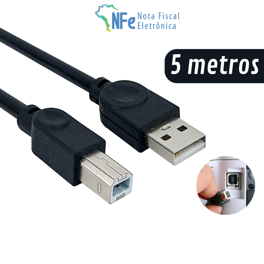 Cabo USB Tipo B com 5 metros para Impressora Scanner Multifuncional Teclado Piano Bateria Eletrônica