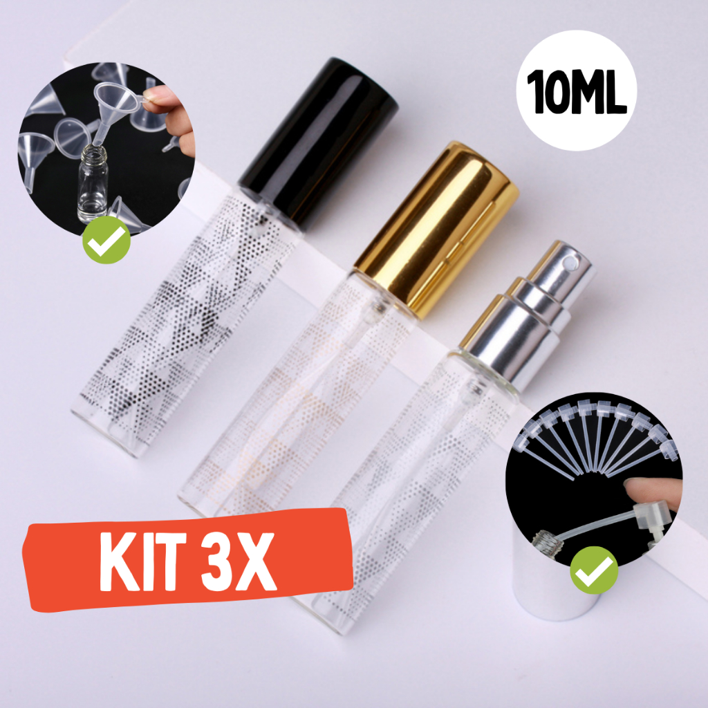 3X Porta Perfume 10ml Spray Vidro Kit Com Bico Decanter e Mini Funil Frasco Recarregavel Portátil