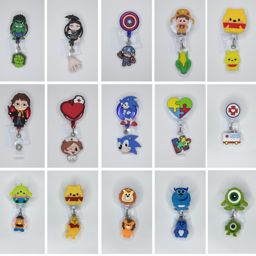 (PARTE 1/5) Porta Crachá Retrátil Roller Clip Personalizados Temático Wandinha | Harry Potter | Toy Story | Ursinho Pooh | Autismo | Super Mário | Meninas Super Poderosas | Capitão América | Homem Aranha | Super Homem | Batman | Minnie | Mickey | Disney