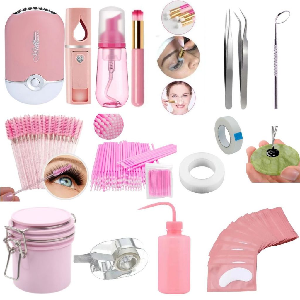 Kit Completo Iniciante Treino Extensão e Alongamento Cílios Shampoo Loveyes Ventilador Nano Spray Pinça Vetus Pisseta Pump Porta Micropore