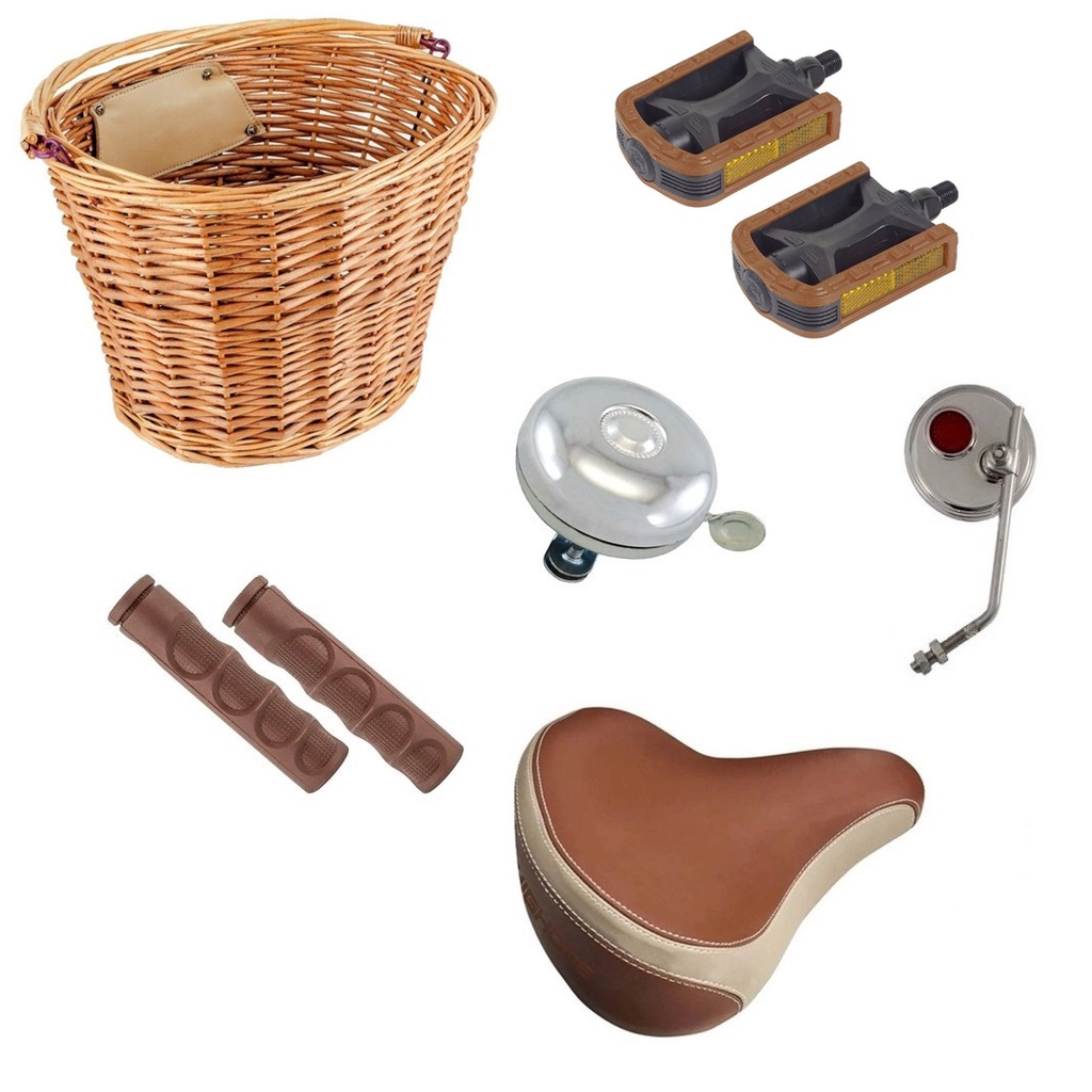 Kit Bicicleta Bike Retrô Cesta para transportar compras, pet Selim retrô com molas e par de Manoplas confortáveis Marrom Vintage