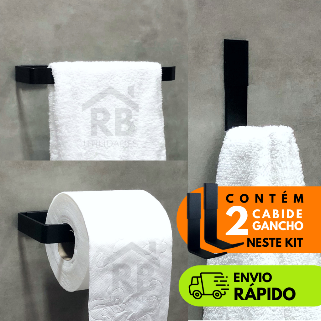 Kit Acessórios Para Banheiro Lavabo 4 peças - Porta Toalha Rosto - Porta Papel Higiênico - 2 Cabide Gancho - Preto - Cromado - Branco - Rose Gold - Decoração Banheiro - Prateleira Banheiro