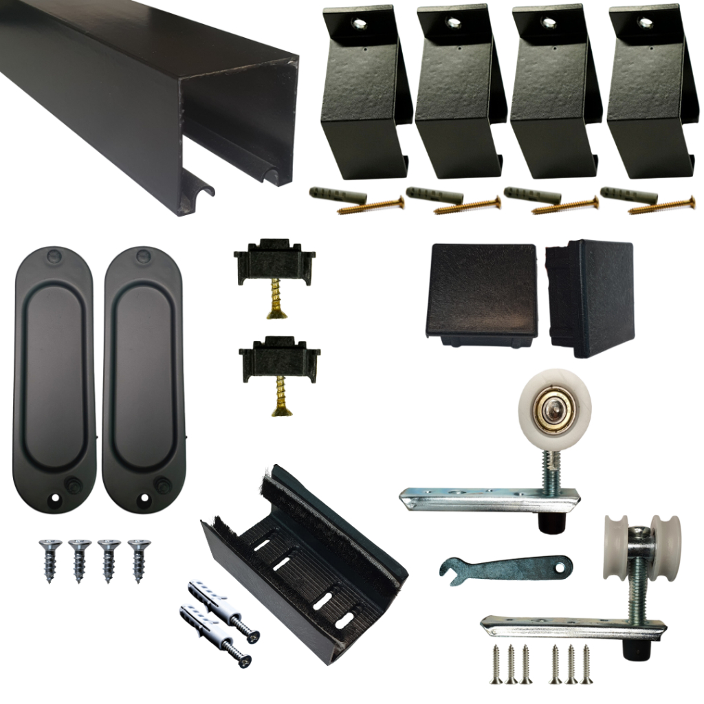 Kit trilho alumínio preto para porta de correr com suportes, roldanas 2 rodas e guia, par de concha injetada (porta não inclusa)