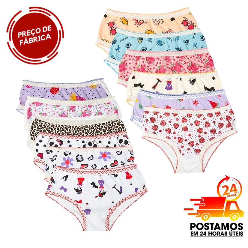 Calcinhas Infantil Kit 10 Un Estampadas E Sortidas Algodão Bebê Calcinha Menina 0 a 7 anos Linha Kids Desfralde