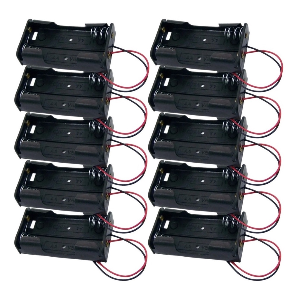 Suporte Porta 2 Pilhas AA 1,5V Cor Preto Com Rabicho - 2 Slots KIT com 10 Peças Para Projetos