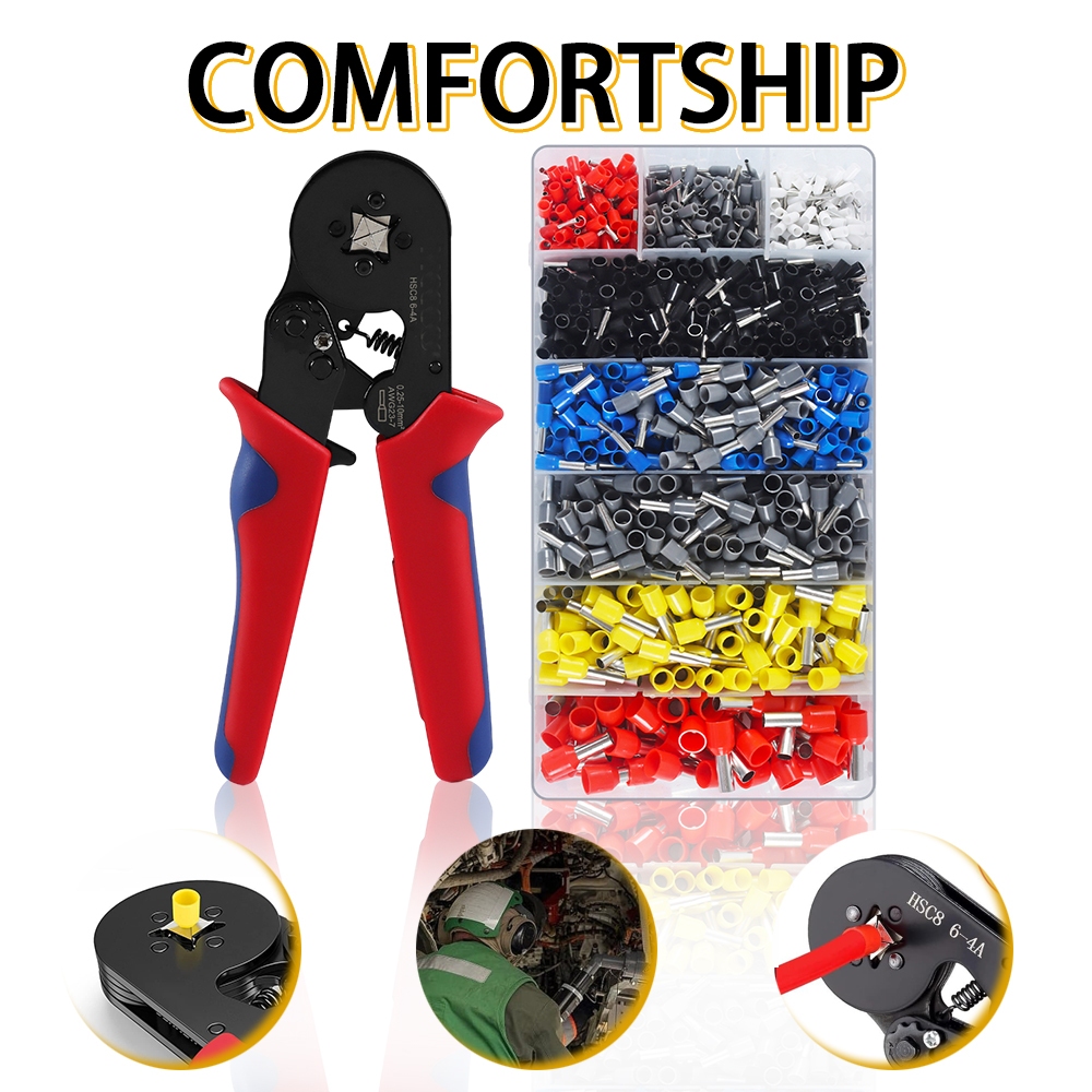 COMFORTSHIP>>Conjunto de alicate de crimpagem, ferramenta de crimpagem de virola de 0,25-10mm² com conectores de virola de extremidade de fio 1200, ferramenta de crimpagem de fio de catraca autoajustável