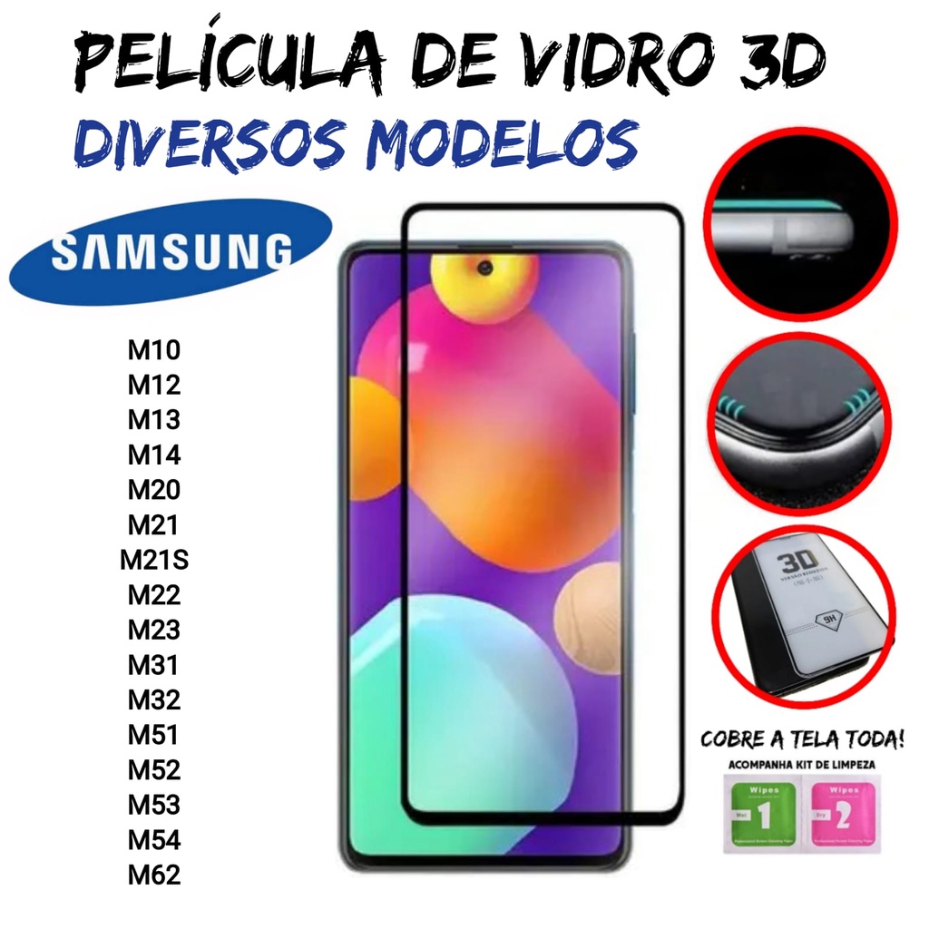 Película 3D de Vidro Temperado Para Samsung - Linha M - M10 / M12 / M13 / M14 / M20 / M21 / M21S / M22 / M23 / M31 / M32 / M33 / M51 / M52 / M53 / M54 / M62