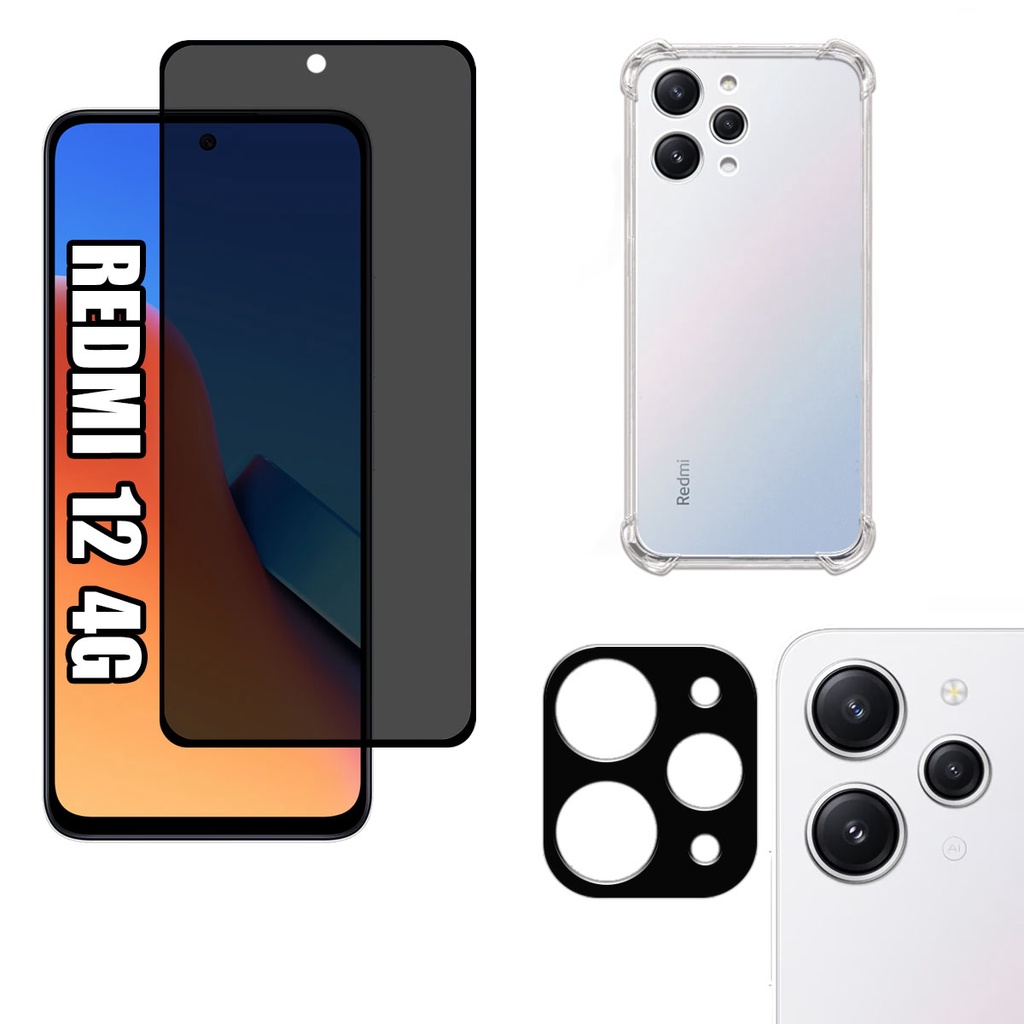 KIT Para Xiaomi Redmi 12 4G | Película de Privacidade 3D - Capa Capinha Anti Shock - Película da Câmera 3D