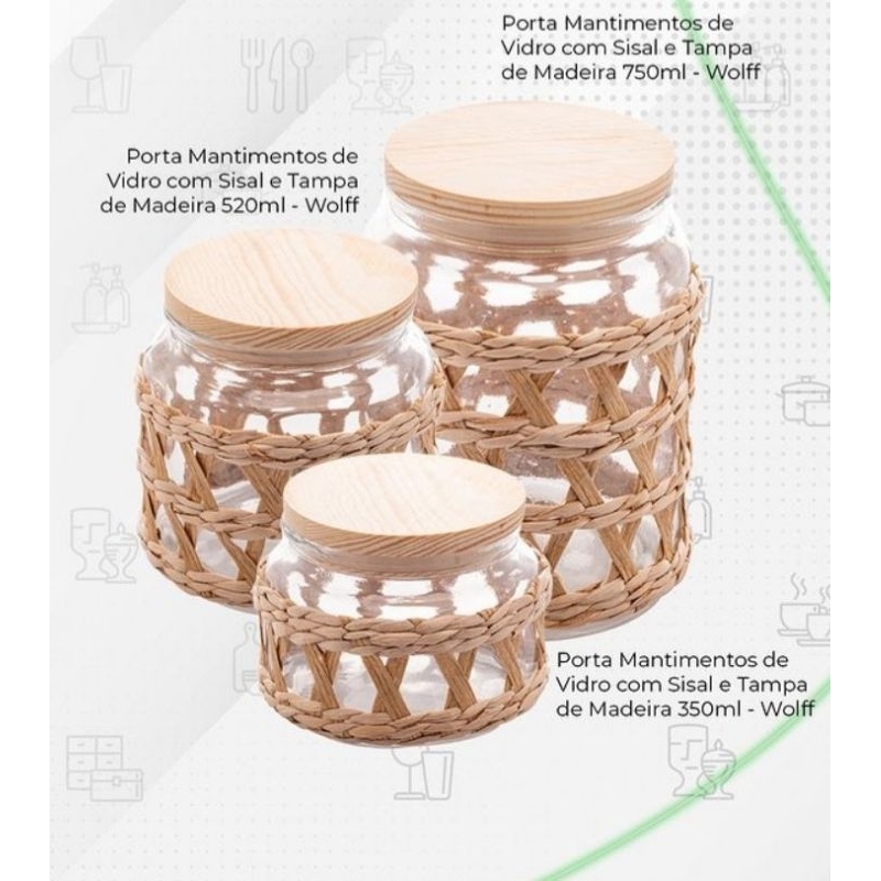Conjunto Pote de vidro com tampa de madeira e detalhes em sisal 350ml/520ml/750ml 3 potes - WOLFF