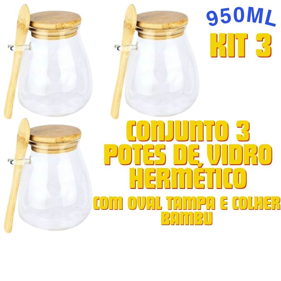 Conjunto 3 Potes De Vidro Hermético 500ML 750ML 950ML Com Oval Tampa E Colher Bambu Para Organização
