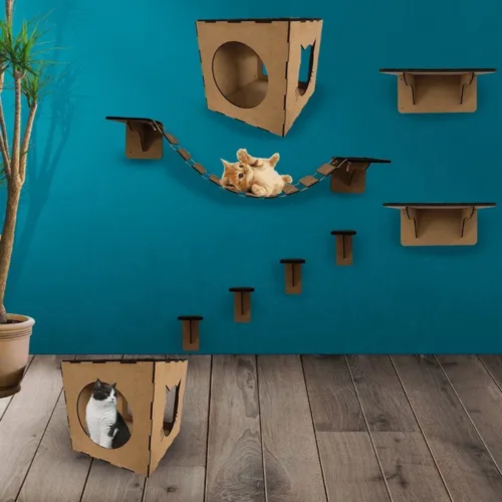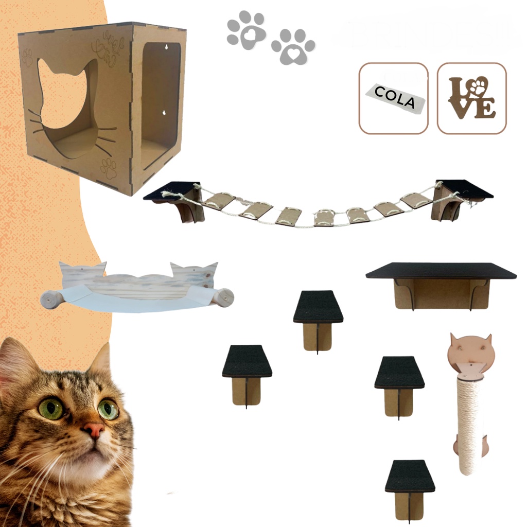 Kit Playground para Gatos Em Mdf Circuito de Parede para Gato 9 Peças Brinquedo de Gato Ponte Nicho Prateleiras Pra Gatos