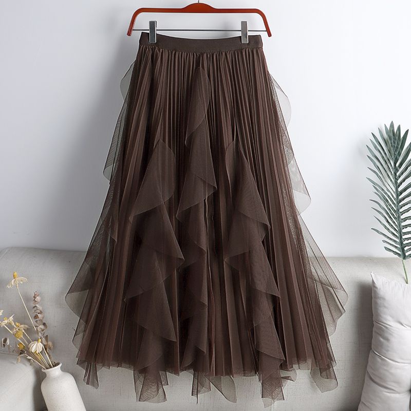2023 novo Retro Pleated Irregular Irregular Irregular Slimmer Look a Mesh Skirt Spring Saia de meio comprimento feminina