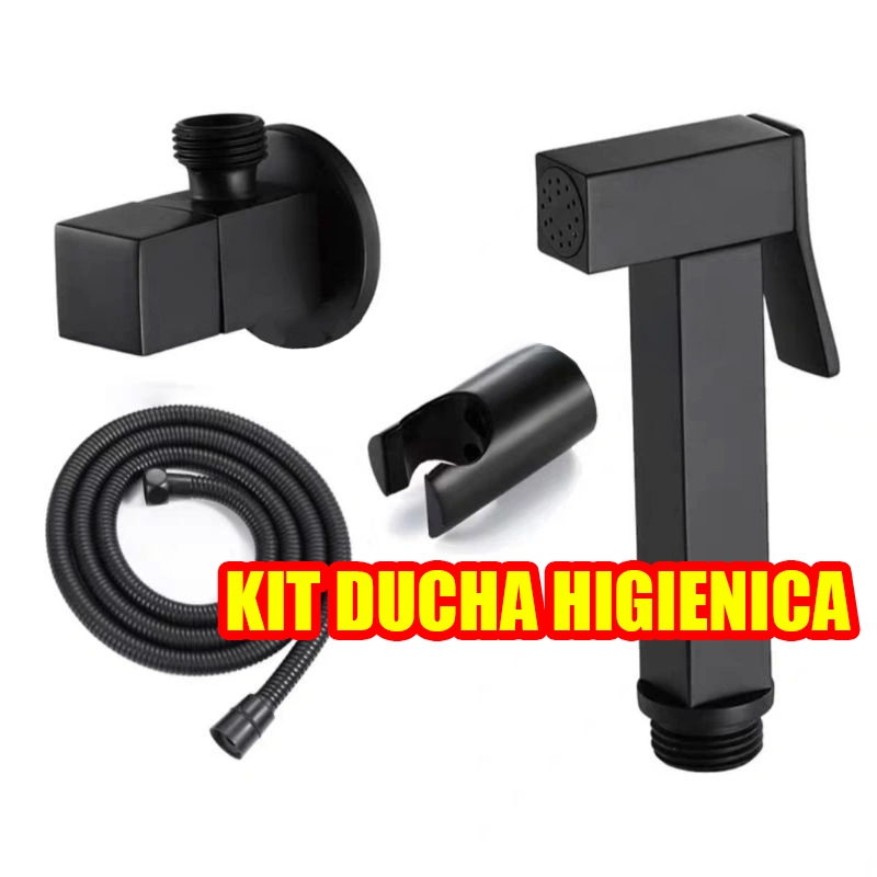 Kit Ducha Higiênica Preta Fosco Banheiro Luxo Completa (Gatilho Master Com Trava De Acionamento E Suporte De Parede + Engate Mangueira Flexível Aço Inox + Registro Quadrado De Metal 1/4 De Volta)