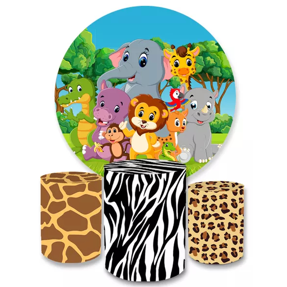 Kit Decorativo Painel Redondo C/ Elástico + Trio Capa Cilindro Safari Selva Festa