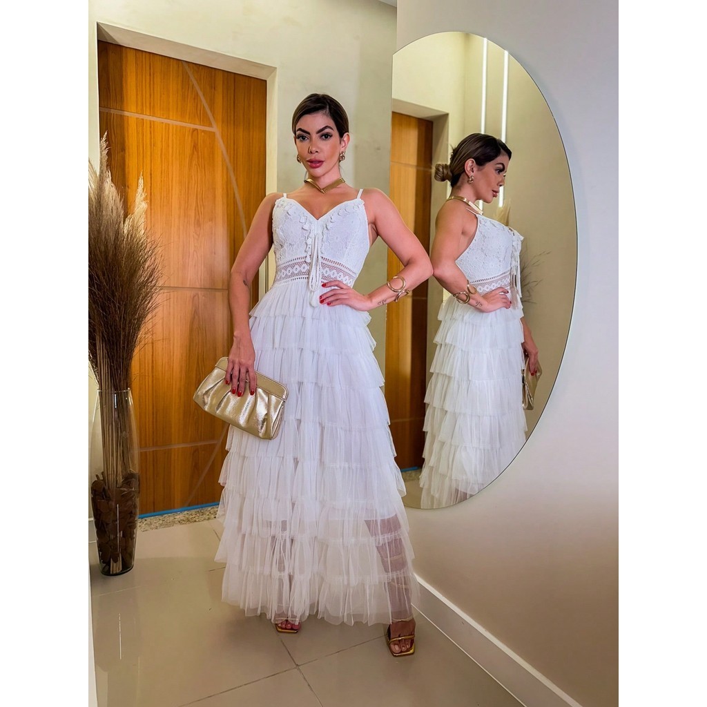 Onsay moda/Vestido Longo De Renda Com Tule/ Decote V/Elástico nas costas/Natal/Praia/Festa//7005