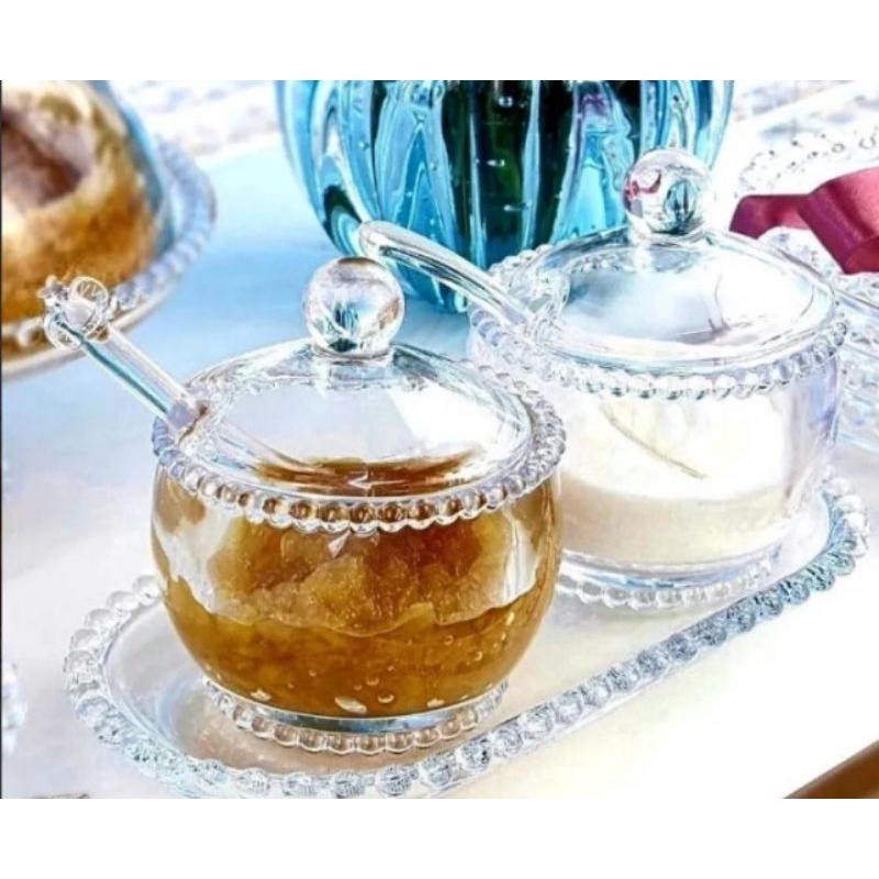 Kit 3 Peças Açucareiro Meleira Bandeja Com Tampa e Colher Bolinha Pearl Transparente Cozinha Mel Cantinho do Café