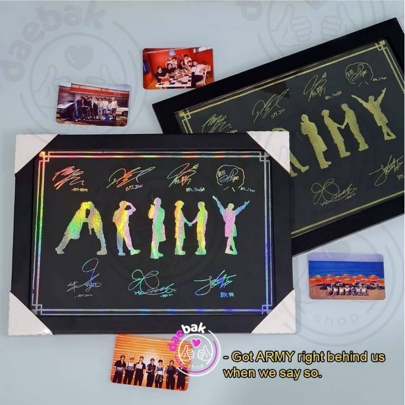 Quadro A4 BTS holográfico/dourado autografado Army Behind Us.