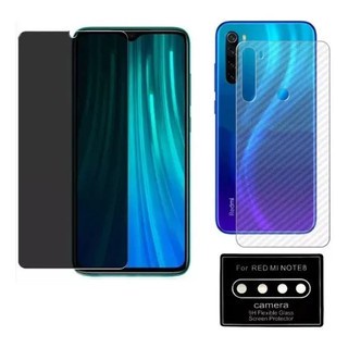 Kit 3X1 Xiaomi Redmi Note 8 - Película Privacidade Vidro 3D + Pelicula de Camera Traseira Nano Gel 5D + Adesivo Fibra de Carbono 9D