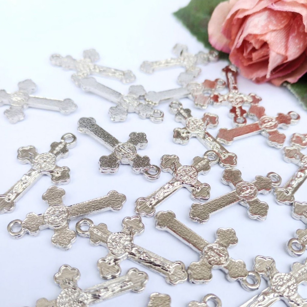 30 Pingente Cruz Duplaface 2cm em Metal Prateado - Pingente Cruz para Terço de pulso artesanato e lembranças