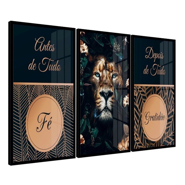 Kit Quadros Decorativos Mosaico 3 Peças Trio Frase Fé Amor Gratidão Leão Judá Tigre Olhos Azuis Floral Vintage Minimalista Delicado Geometrico Presente