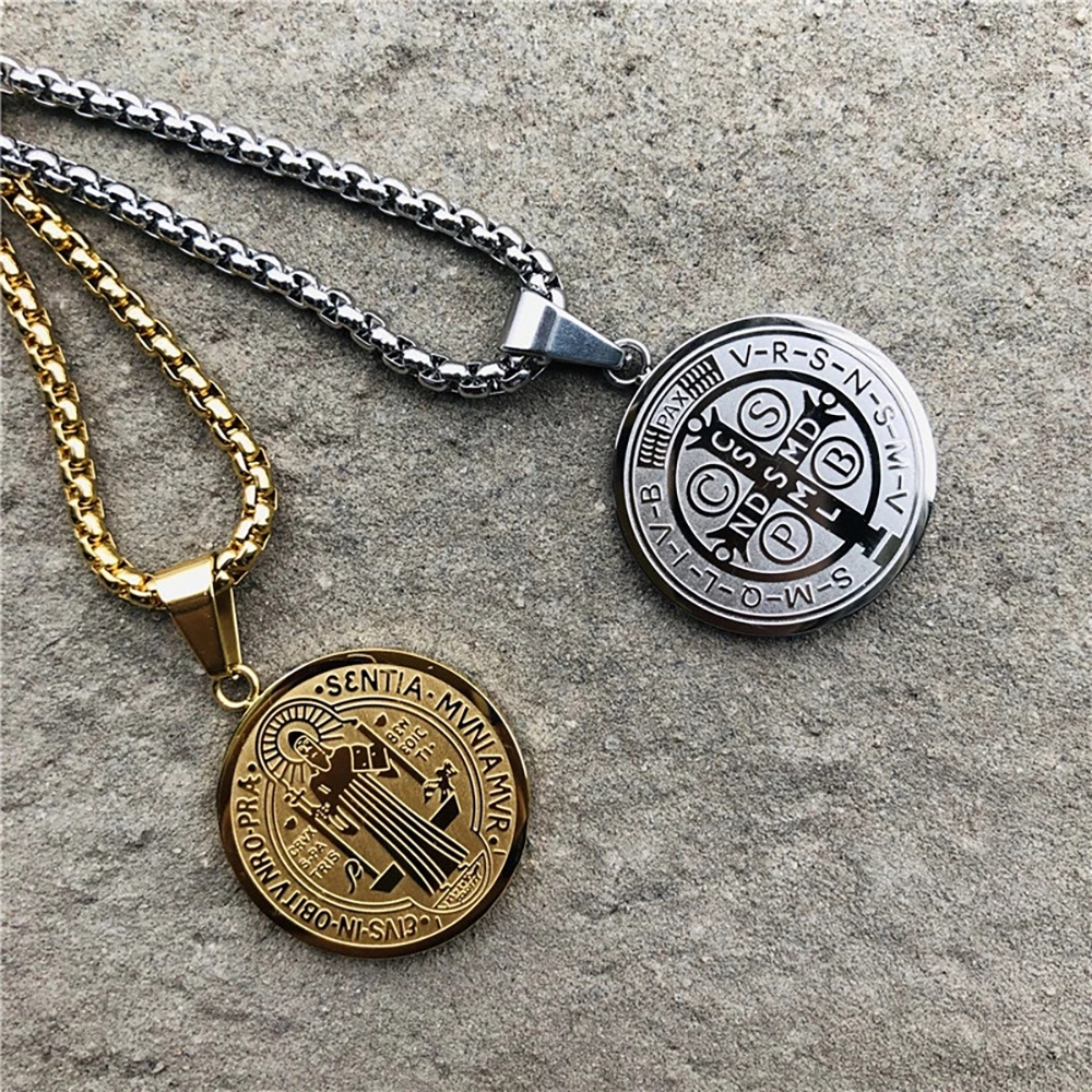 Colar Aço inoxidável com Pingente Medalha de São Bento Banhado a Ouro 18K Aço Cirúrgico