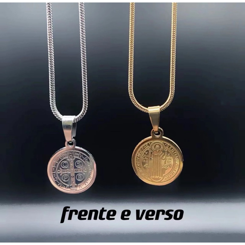 Colar Corrente Aço inoxidável Com Pingente Medalha De São Bento Banhado a Ouro 18K Aço Cirúrgico