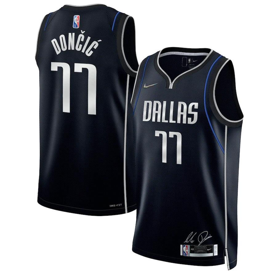 Novo Original Masculino NBA Dallas Mavericks # 77 Luka Doncic City Edition Jersey Azul-Marinho Prensado A Calor
