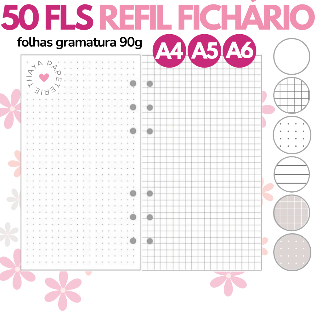 refil fichário binder 50 folhas de 90g pontilhadas quadriculadas linhas brancas lisas pautadas fichas a6 a5 a4 e extra grande tamanho sulfite
