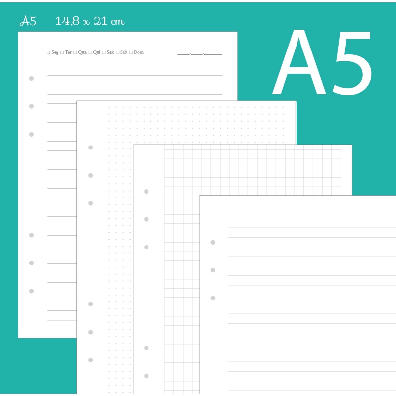 Refil Para Fichário Planner A5 90g Pautado Quadriculado Pontilhado Branco 15 x 21 cm 70 folhas 50 folhas