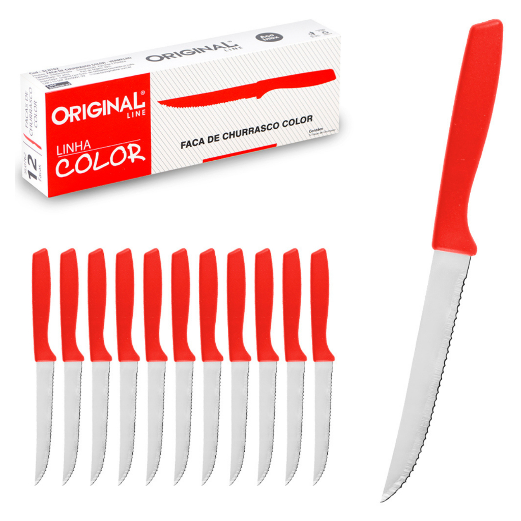 Kit com 12 Faca de Mesa, Churrasco Talher de Aço Inox 22cm com Cabo Colorido Linha Original