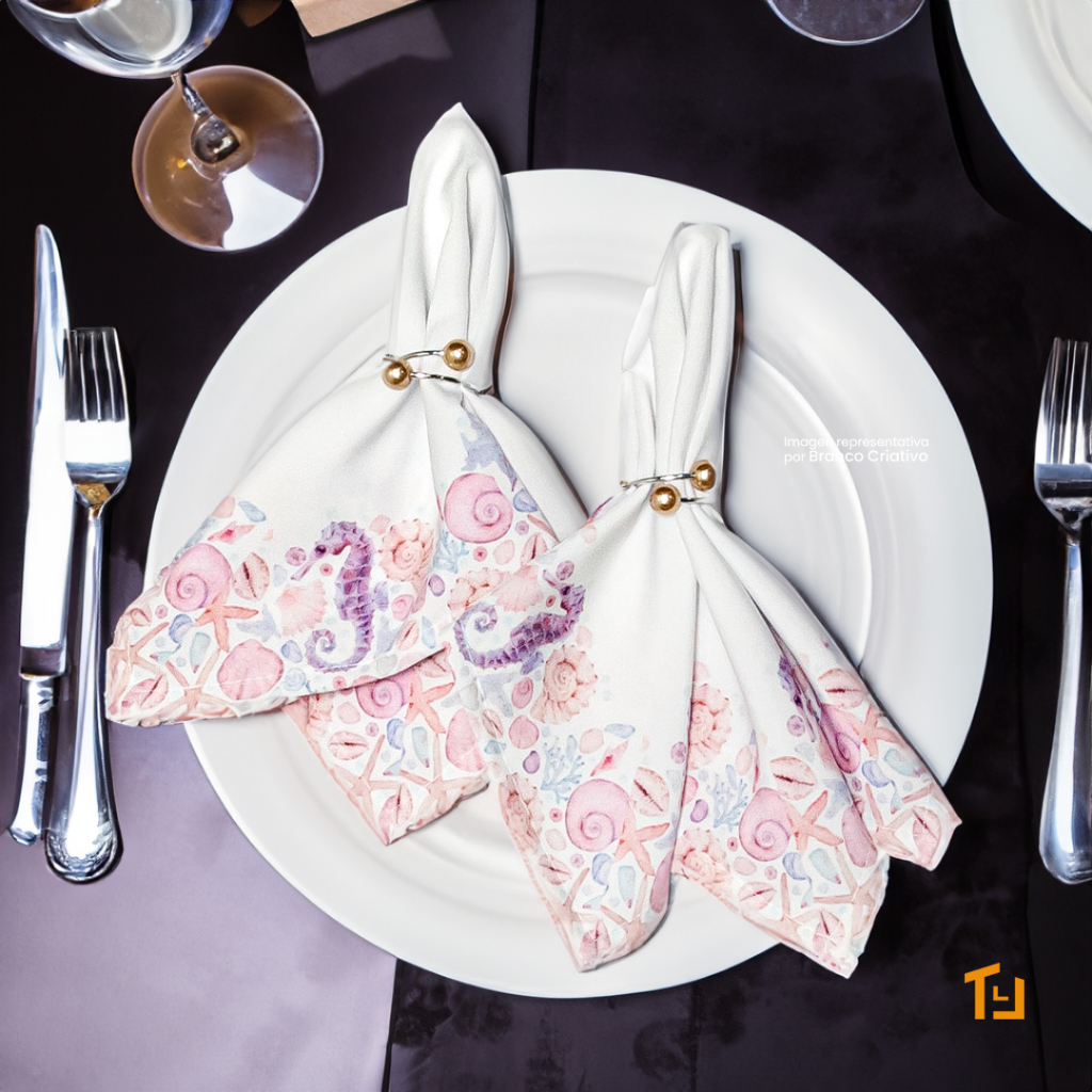 Kit com 12 Peças Guardanapo Tecido Micropercal 200 Fios com Bainha 35 x 35 cm - Estampa Fundo do Mar - Mesa Posta