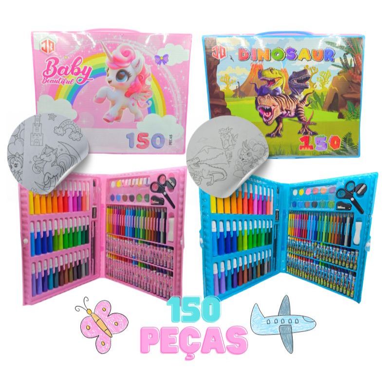Maleta De Pintura Infantil Estojo 150 68 48 24 e 86 Peças Para Colorir Kit de Desenhar Canetinhas Meninas Unicórnio Carros Dinossauro
