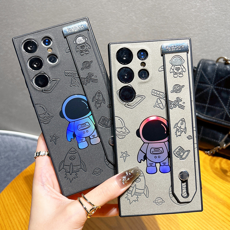 Luxo Matte Leather Laser Astronaut Suporte De Pulseira De Couro Para Samsung Galaxy S23 S22 Ultra Fashion Wristband À Prova De Choque Capa De Telefone Caixa
