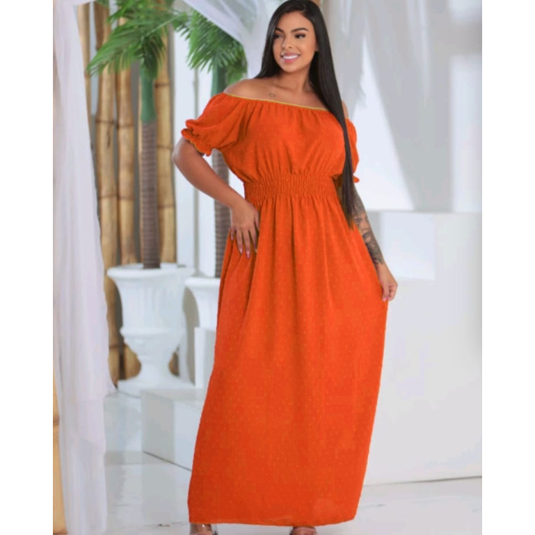 Vestido Pipoquinha Laranja Telha longo moda feminina tecido duna pipoca manga princesa estica veste até plus size EXG festa casamento madrinha