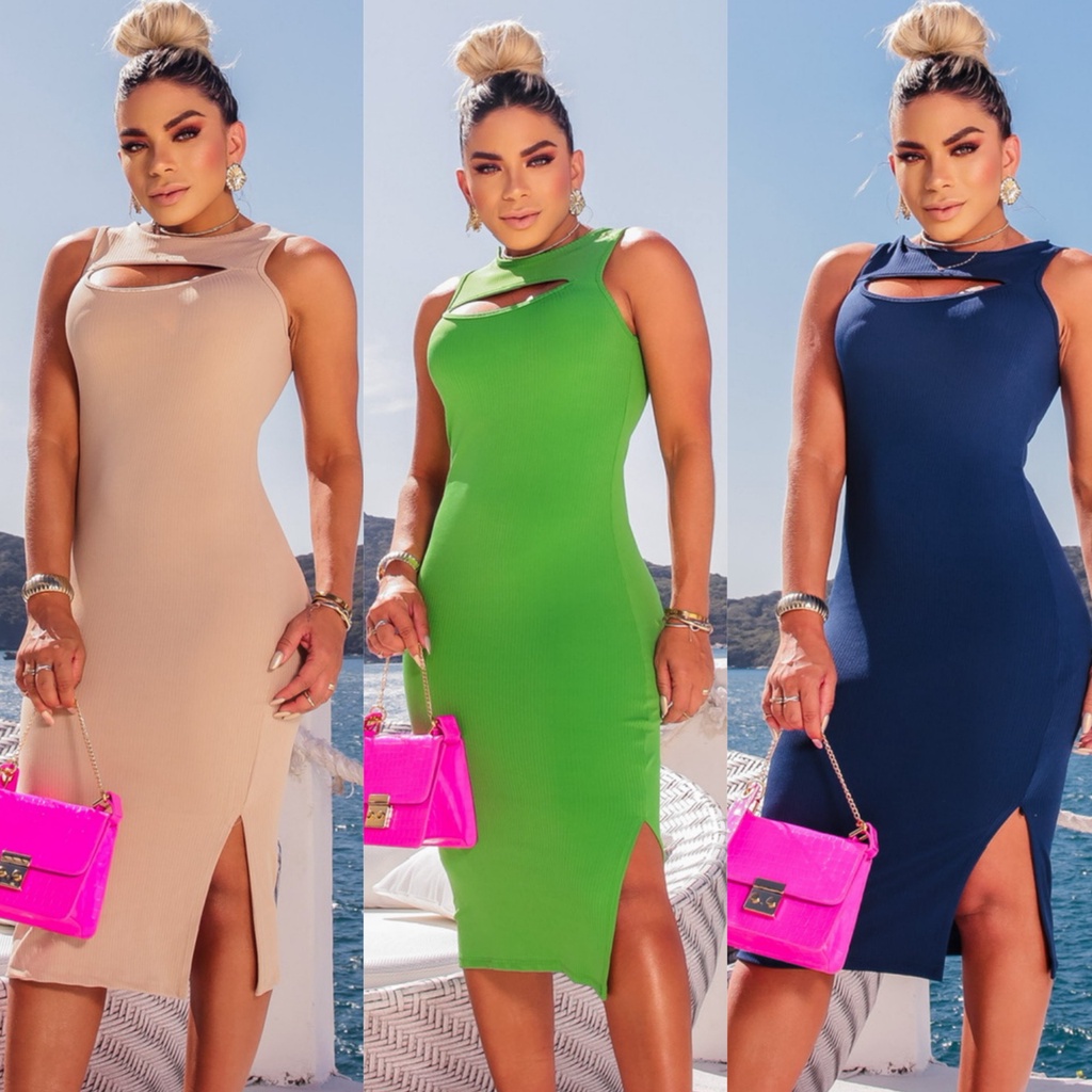 Vestido Midi Alça Decotado Na Frente Com Bojo Fenda Lateral Canelado Lançamento Verão Moda Gringa Fashion