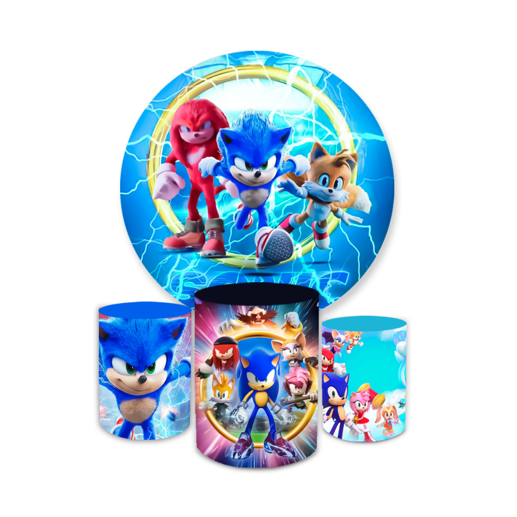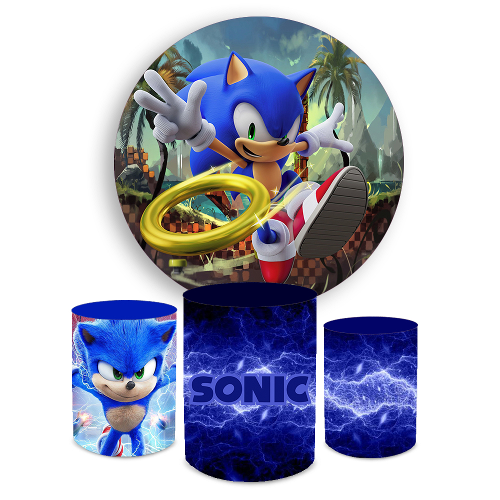 Kit Festa Decoração Capa Painel Redondo + Trio Capas de Cilindros Tema Sonic Desenho Infantil