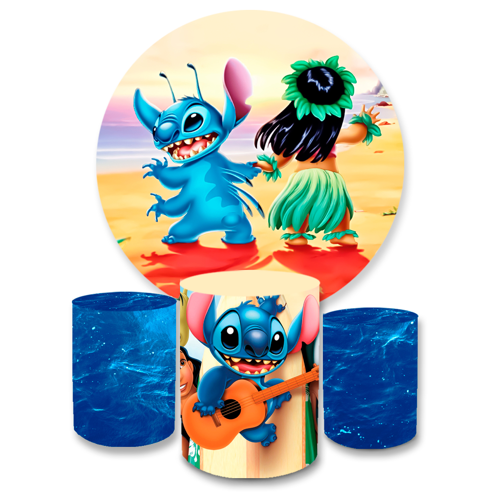 Kit Festa Infantil Capa Painel Redondo + Trio Capas de Cilindros Tema Lilo e Stitch Menino Menina