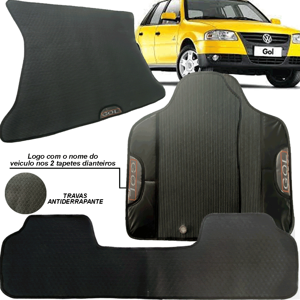 KIT CONJUNTO JOGO COMPLETO TAPETE AUTOMOTIVO 3 PEÇAS PORTA MALA CARRO VOLKSWAGEN GOL G4 2005 A 2008 TODOS EMBORRACHADO PERSONALIZADO COM NOME GOL