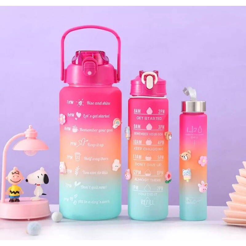 Kit 3 Garrafa de Agua Grande 2 Litros - 900ML - 300ML Squeeze Colorida Com Adesivos Canudo e Frases Motivacionais
