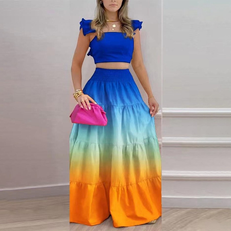 Conjunto De Saia De Verão Feminina Sem Mangas Boho Cortado Colorido Gradiente Cor Sólido Elástico Cintura Longa Fashion Two Piece