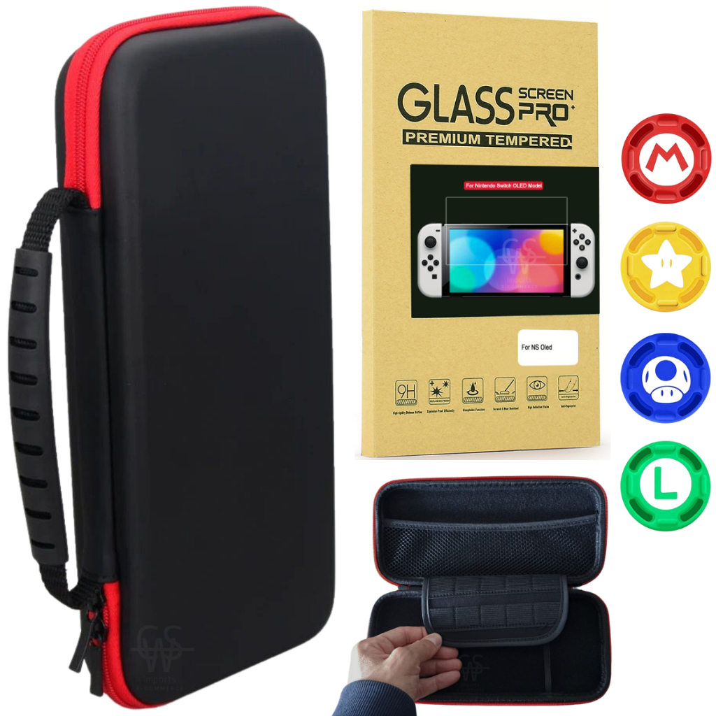 Case Estojo Bag Transporte Proteção Rígida Nintendo Switch Novo Oled+ Película De Vidro Temperado + 4 Grips
