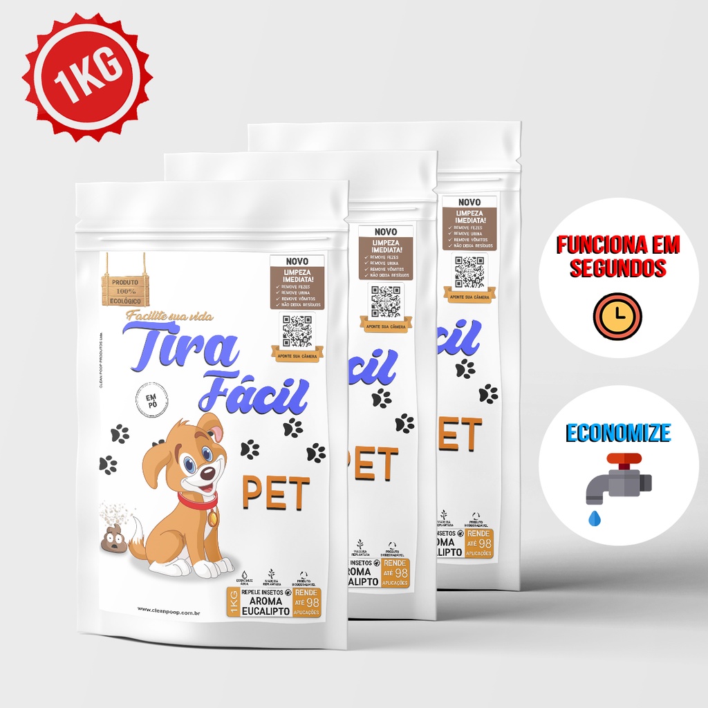 3x Pó Higiênico P/Cães e Gatos Tira Fácil - 1Kg - Seca e Absorve Cocô, Xixi, Vômito em segundos - Perfumado e Repelente - Ecológico