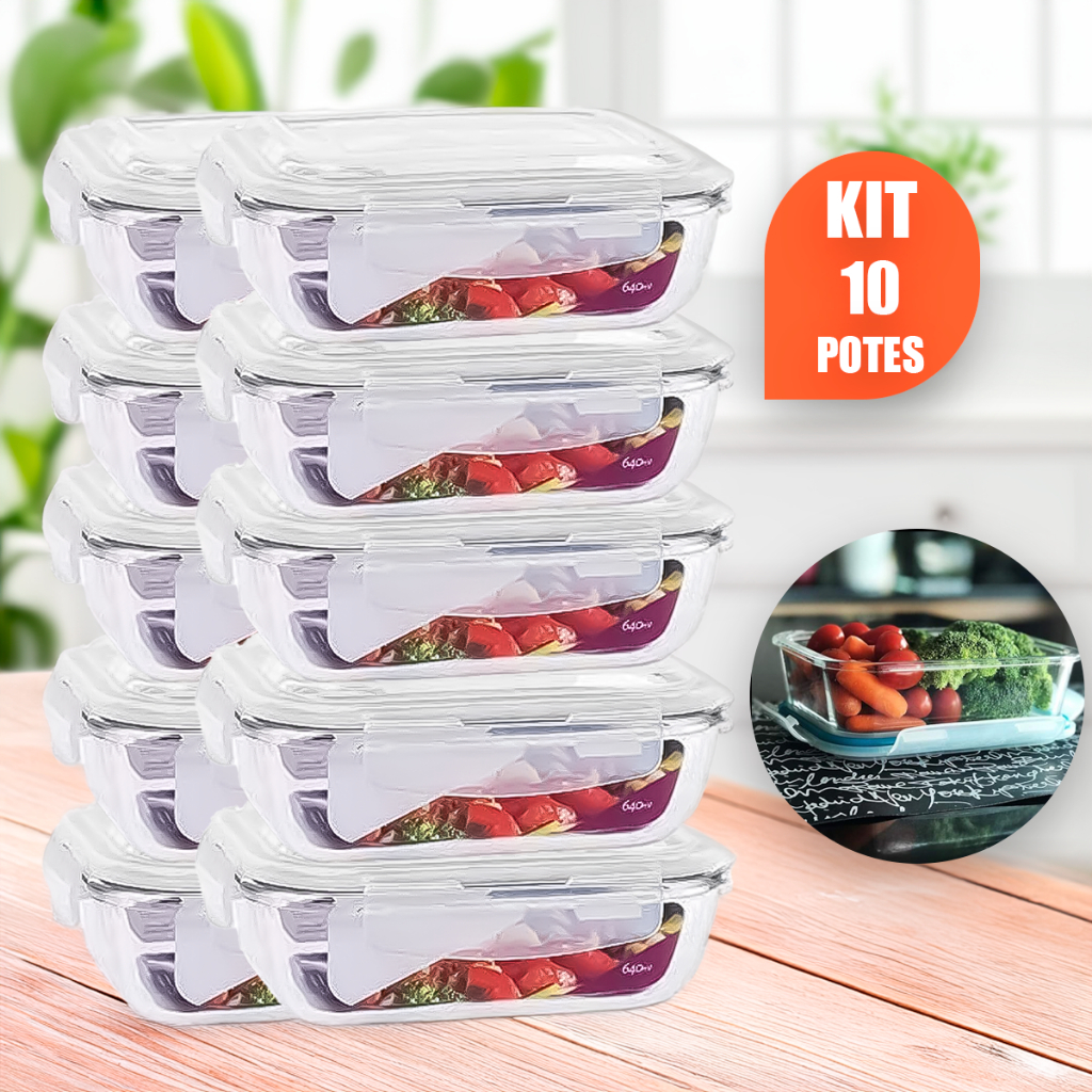 Kit 10 Potes 1040ml/640ml/550ml/370ml de Vidro Hermético Marmita Fit com Tampa 4 Travas