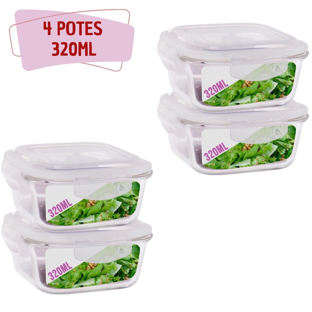 Kit 4 Potes Tampa Hermetica Quadrado de Vidro 320ml Alimento