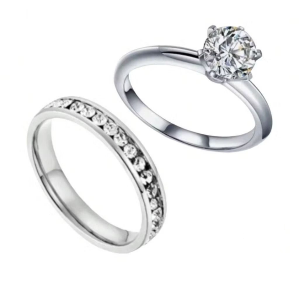 Kit Conjunto de Anéis Solitário e Aparador Cor Prata com Pedras Zirconias Aço inoxidavel Moda beleza Feminina