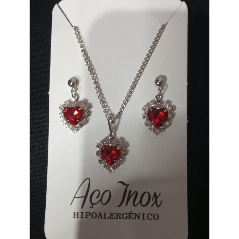 kit conjunto colar e brinco feminino aço inoxidável pingente de coração strass