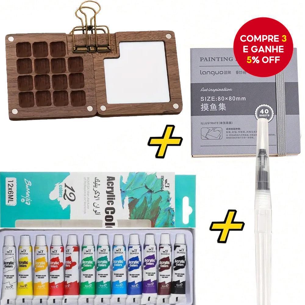 Kit Mini de Pintura em Aquarela 5 Pcs - Kit de Pintura Portátil para Artistas - Caixa de Madeira com 15 Grelhas Mini